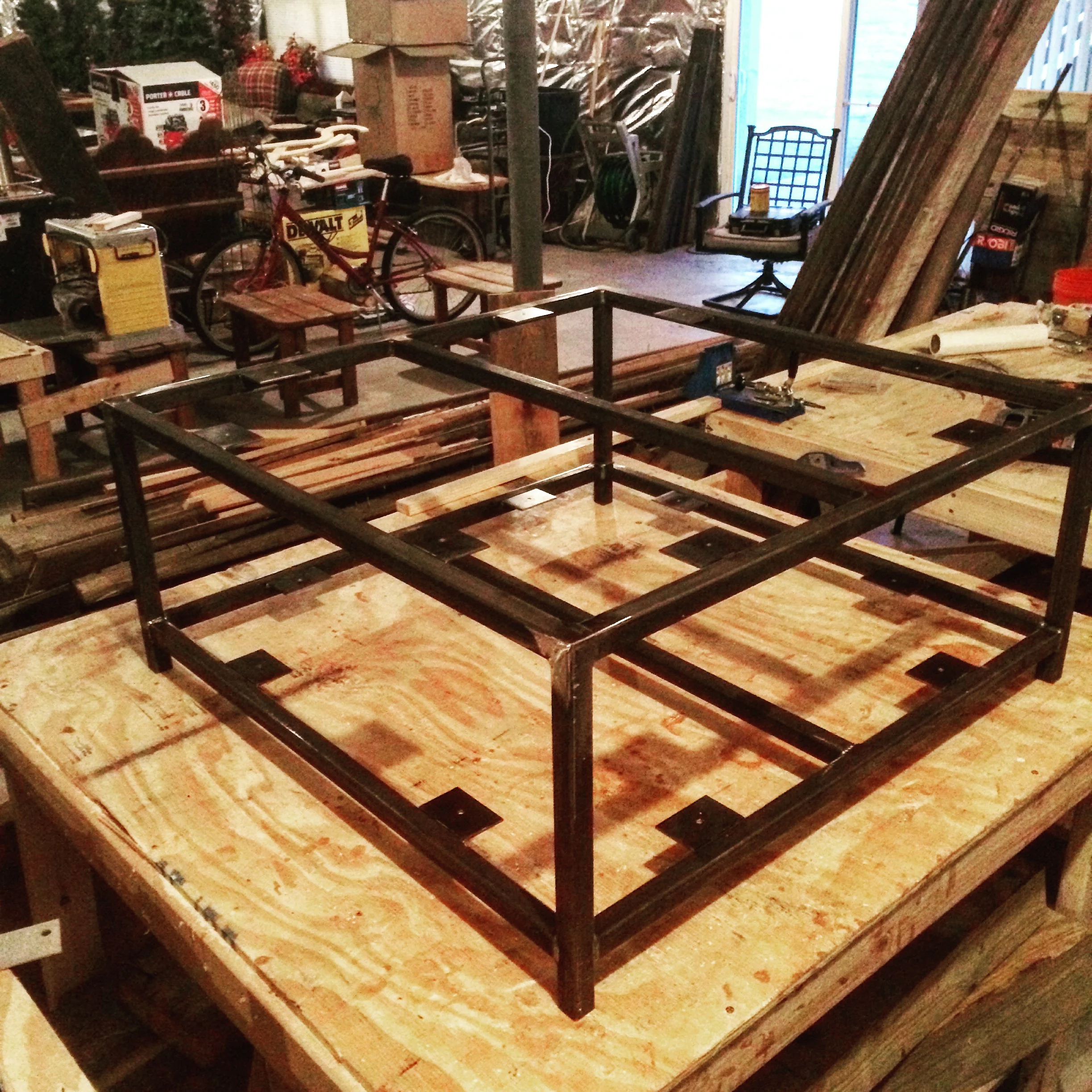 Tongue and Groove reclaimed railcar flooring table with steel tube frame. 40"W x 40"D x 18"H
